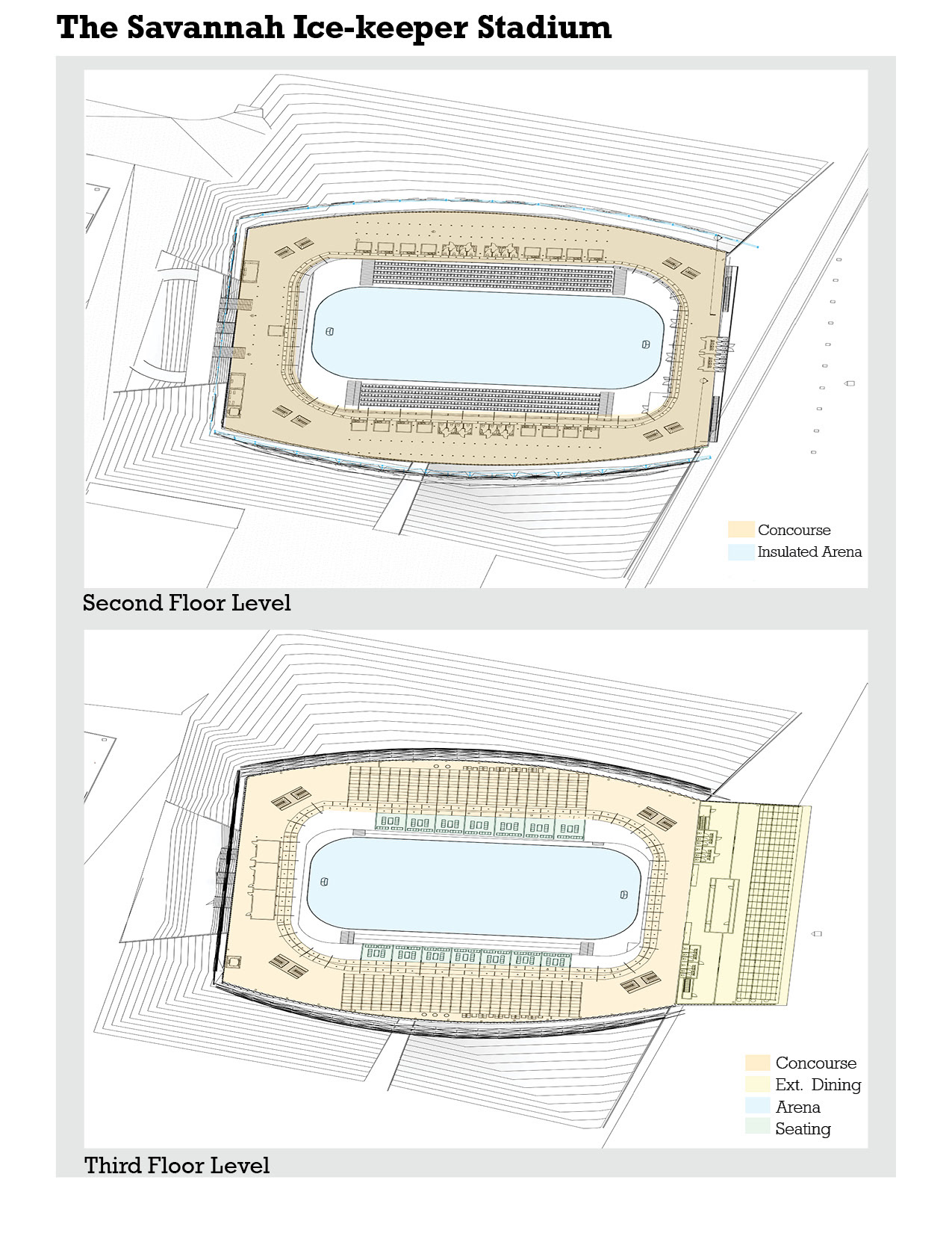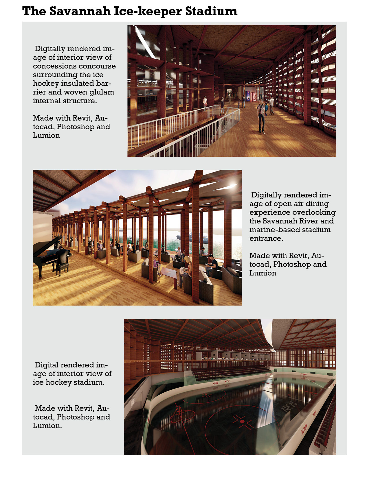 A stadium that seeks to find harmony between two contrasting elements, the hot humid environment of Savannah and the frigid temperatures required by ice rinks. By using passive sustainable techniques and site manipulation, my goal was to provide an innovative game day experience that utilizes the existing qualities of the site to its best advantage.
